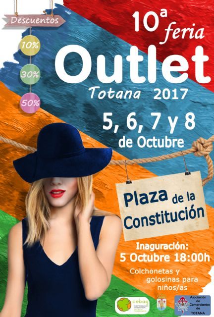 Comercios adheridos a la Asociación de Comerciantes de Totana participarán en la X Feria Outlet de esta localidad, que este año se celebra desde este jueves al domingo, del 5 al 8 de octubre, en la plaza de la Constitución, y que espera congregar, como en ediciones anteriores, a numerosos visitantes y clientes.