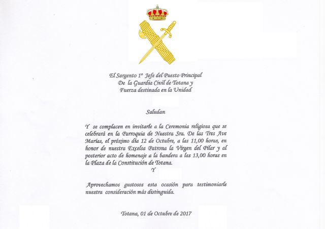 "El 12 de octubre celebramos el aniversario del Descubrimiento de América y la festividad de Nuestra Señora del Pilar, patrona de España y de la Guardia Civil."