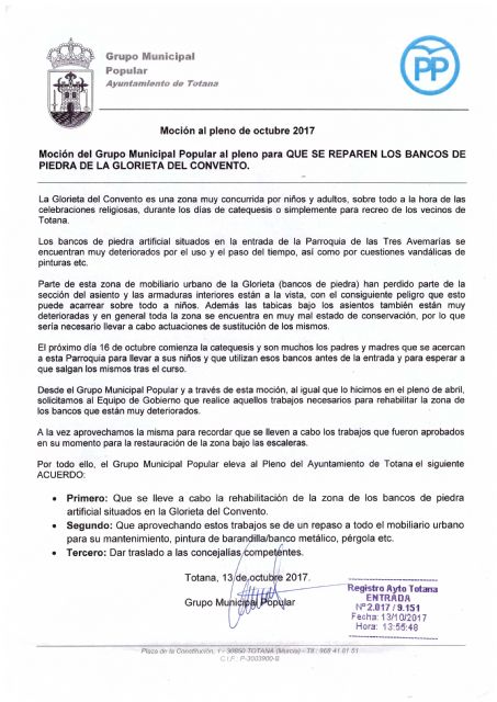 El pasado 13 de octubre el Grupo Popular presentaba, dentro de plazo, una moción en la que se instaba a la Concejalía pertinente a que llevase a cabo la rehabilitación de los bancos de piedra artificial situados en la Glorieta del Convento por el mal estado en el que se encuentran, dicha moción no ha sido incluida en la convocatoria del pleno por una interpretación del Señor Alcalde, que lo ha considerado como un ruego.