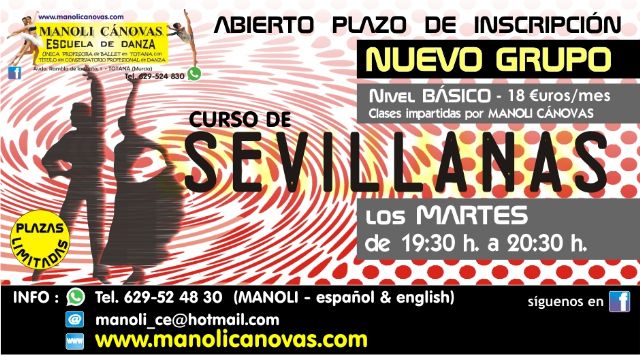 La Escuela de Danza Manoli Cánovas va a poner en marcha dos nuevos cursos, el de SALSA será de la mano de Luis Sanjuán de Murciabaila y el de SEVILLANAS será de la mano de la directora de la Escuela.