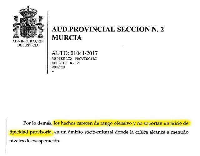 El director de Totana.com ha mostrado su satisfacción tras conocer la resolución judicial que echa por tierra la querella presentada por el Sr. Cañizares Tudela,  destacando tal y como recoge el contundente auto judicial, que no existió rango ofensivo en lo publicado por este portal.