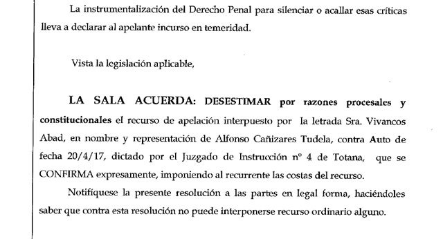 Por todo ello, la Audiencia Provincial de Murcia acuerda desestimar el recurso interpuesto por el querellante Alfonso Cañizares Tudela, confirma la resolución judicial del Juzgado de Totana y lo condena en costas por temeridad y mala fe.