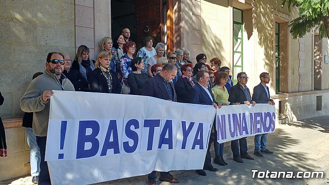 Autoridades municipales, empleados públicos y vecinos de Totana guardaron hoy un minuto de silencio a las puertas del Consistorio totanero como señal de repulsa y condena por el último caso de violencia machista en la localidad alicantina de Elda, en el que una joven de 28 años murió tras ser tiroteada por su expareja, cuando se disponía a recoger a su hijo en el colegio.
