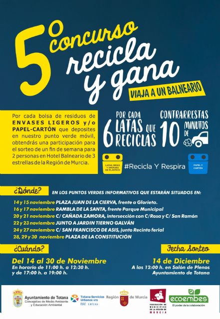 El Ayuntamiento de Totana ha iniciado, como en años anteriores, la campaña de información y sensibilización ambiental que lleva por título este año "Recicla y respira", que se realiza en colaboración con la empresa "Ecoembalajes España, SA" (Ecoembes) con el fin último de incentivar la reducción de residuos sólidos urbanos, la separación en origen y el consiguiente reciclaje de envases.