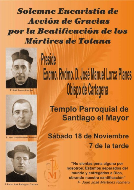 El pueblo de Totana celebrará una Eucaristía de acción de gracias por la beatificación de tres mártires de la familia vicenciana, dos de ellos naturales del municipio (Juan José Martínez Romero y Pedro José Rodríguez Cabrera) y otro natural de Cartagena (José Acosta Alemán), cuya última misión pastoral y martirio fue en este lugar. La parroquia de Santiago El Mayor acogerá, a las 19:00 horas, la celebración, presidida por el Obispo de Cartagena, Mons. José Manuel Lorca Planes, en la que tendrá lugar la inhumación de las reliquias de los tres beatos, que serán colocadas en el altar de la capilla de la Virgen del Carmen, según informaron desde el Obispado en un comunicado.