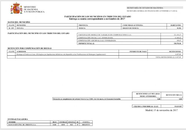 El 16 de noviembre, conocíamos la resolución de la Secretaría General de Financiación Autonómica y Local, mediante la cual se comunicaba al Ayuntamiento de Totana la aprobación de la concesión de la medida solicitada, con el fin de sustituir con esa operación la aplicación de retenciones en la participación en tributos del Estado, que actualmente se venía aplicando para compensar las deudas con el ahora Fondo en liquidación para la Financiación de los Pagos a Proveedores.