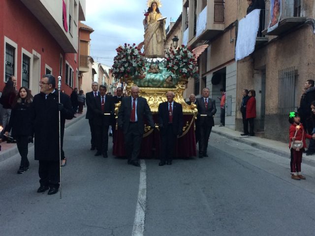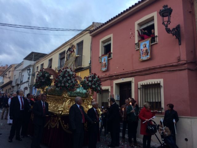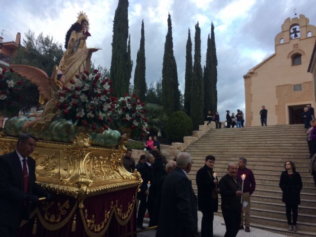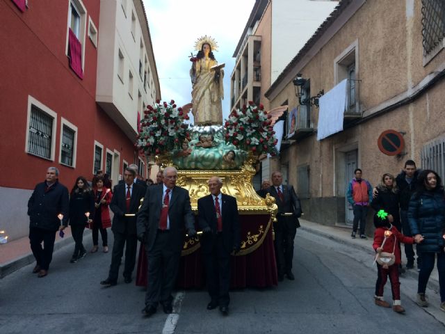 Una comitiva institucional presidida por el primer teniente de alcalde de Totana, Juan José Cánovas, ediles de la Corporación municipal, autoridades religiosas, miembros de la Fundación La Santa y la banda municipal de la Agrupación Musical de Totana, acompañó a la imagen de la Patrona por las calles de esta localidad hasta el templo parroquial.