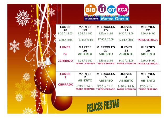 La Concejalía de Cultura del Ayuntamiento de Totana informa del horario de apertura tanto de la Biblioteca Municipal "Mateo García", como de la Sala de Estudio ubicada en el Centro Sociocultural "La Cárcel", que se verá modificado en parte con motivo de las fiestas de Navidad y Reyes.
