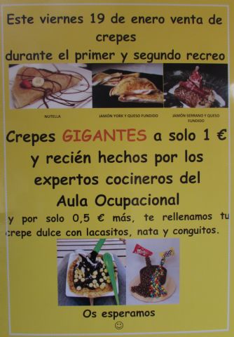 "El alumnado del Aula Ocupacional nos ha sorprendido de nuevo, esta mañana, y en el recreo, nos han preparado y vendido, crêpes salados y dulces que han hecho las delicias de toda la comunidad educativa. Esta iniciativa comenzó el pasado viernes día 17 de noviembre, y tras el éxito de la anterior visita, nuestros alumnos del Aula Ocupacional de la especialidad de Cocina, han repetido la experiencia en dos ocasiones.