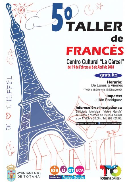 La Concejalía de Cultura organiza el 5° Taller de Francés, de carácter gratuito, que se celebrará del 19 de febrero al 6 de abril, en el Centro Sociocultural "La Cárcel", impartido por Julián Rodríguez.