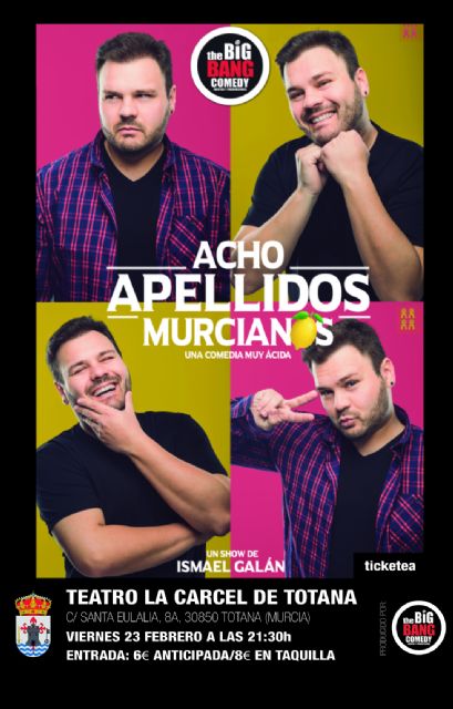 La Concejalía de Cultura oferta, dentro de la programación del "Totana Cultural", el próximo 23 de febrero, a las 21:30 horas, el show-espectáculo "Acho apellidos murcianos", del cómico Ismael Galán, en el teatro "Ginés Rosa", del Centro Sociocultural "La Cárcel".