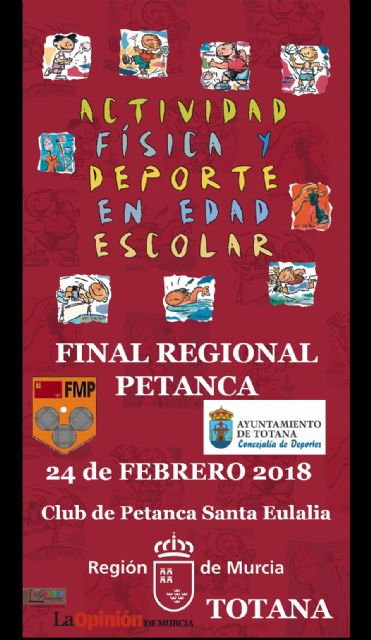 Este próximo sábado 24 de febrero tendrá lugar, en las instalaciones del Club de Petanca "Santa Eulalia" de Totana, la Final Regional de Petanca de Deporte Escolar, organizada por la Dirección General de Deportes de la Región de Murcia y la Concejalía de Deportes del Ayuntamiento de Totana.