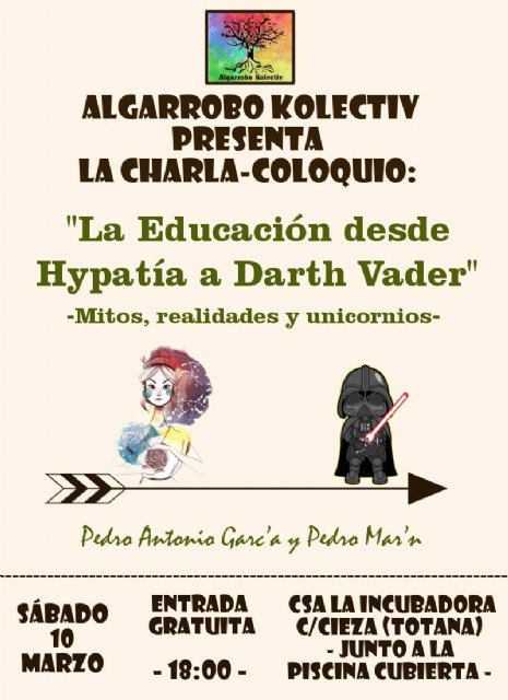 El próximo sábado 10 de marzo a las 18:00 tendrá lugar la charla-coloquio "La Educación desde Hypatía hasta Darth Vader - Mitos, realidades y unicornios", que está organizada por Algarrobo Kolectiv.