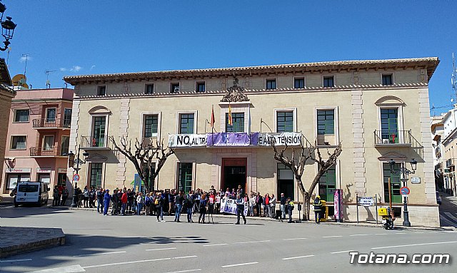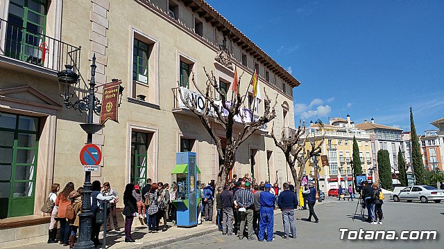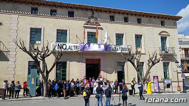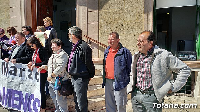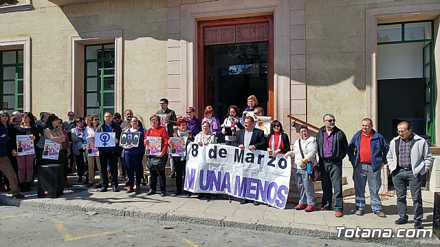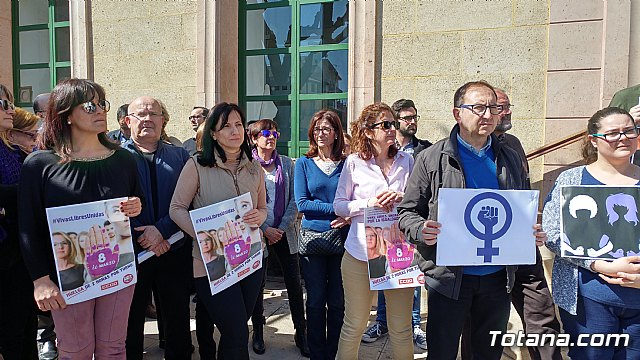 Autoridades del Gobierno municipal participaron esta mañana en el acto de apoyo a la huelga general parcial convocada por las organizaciones sindicales UGT y CCOO en el Ayuntamiento de Totana con motivo de la celebración del Día Internacional de la Mujer, que se conmemora hoy 8 de marzo.