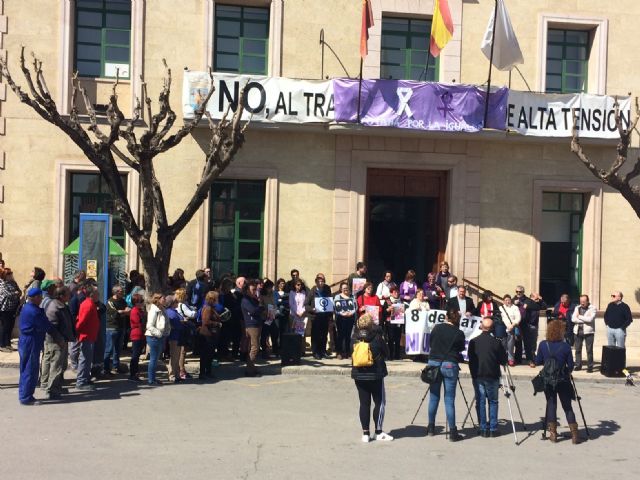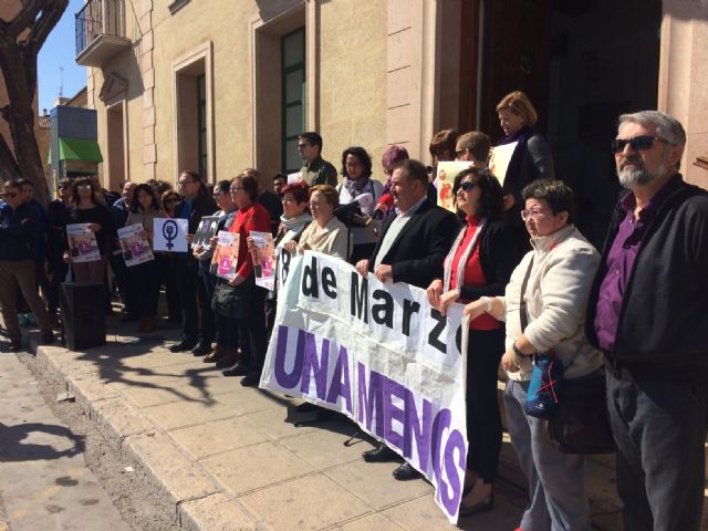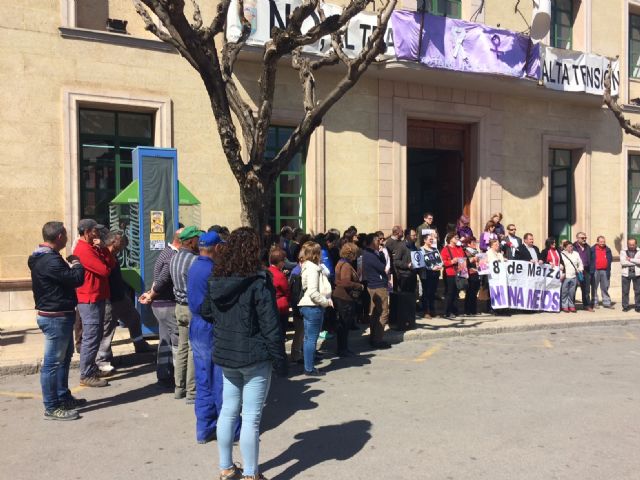Autoridades del Gobierno municipal participaron esta mañana en el acto de apoyo a la huelga general parcial convocada por las organizaciones sindicales UGT y CCOO en el Ayuntamiento de Totana con motivo de la celebración del Día Internacional de la Mujer, que se conmemora hoy 8 de marzo.