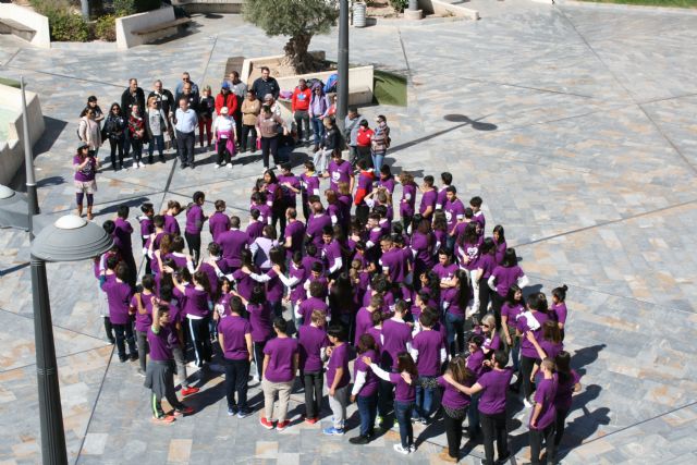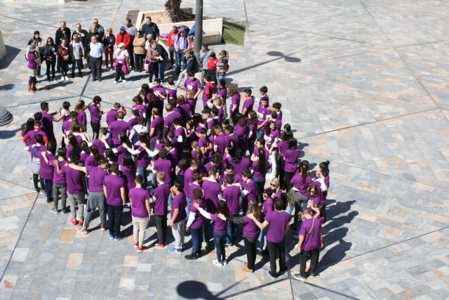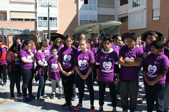 Más de un centenar de alumnos y alumnas de Educación Secundaria de diferentes centro de enseñanza y usuarios de los centros de día de discapacidad de Totana formaron hoy un corazón humano en la plaza de la Balsa Vieja de esta ciudad para escenificar sus "latidos" por la Igualdad con motivo del programa de actos conmemorativos por el Día Internacional de la Mujer.
