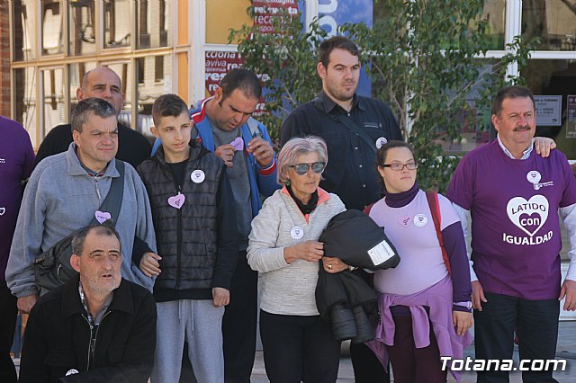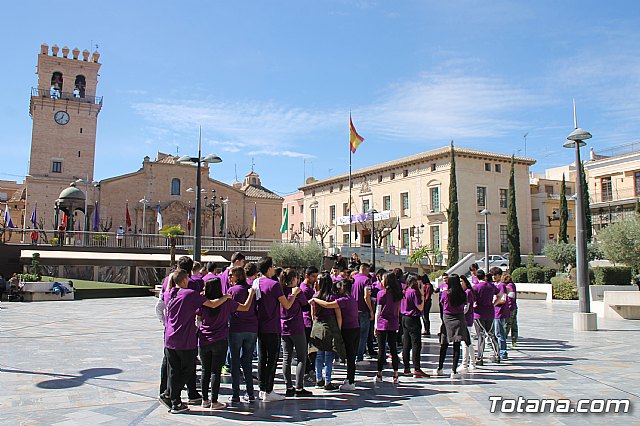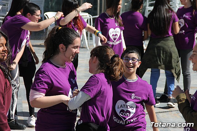 Más de un centenar de alumnos y alumnas de Educación Secundaria de diferentes centro de enseñanza y usuarios de los centros de día de discapacidad de Totana formaron hoy un corazón humano en la plaza de la Balsa Vieja de esta ciudad para escenificar sus "latidos" por la Igualdad con motivo del programa de actos conmemorativos por el Día Internacional de la Mujer.