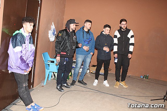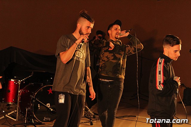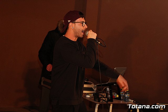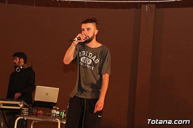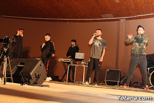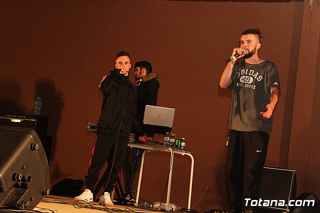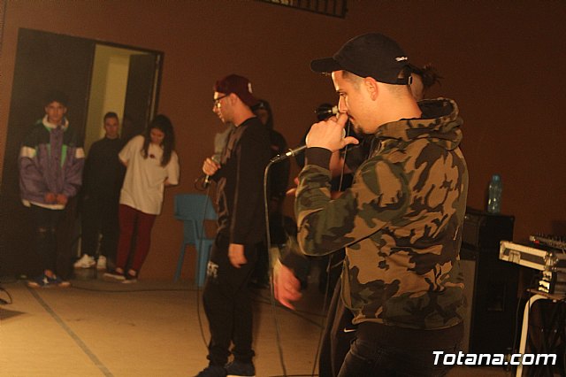 En el festival participaron un total de nueve artistas o grupos de Totana y fuera que deleitaron a los jóvenes asistentes con sus canciones de rap y reggae, en lo que se conoce popularmente como "batallas de gallos".
