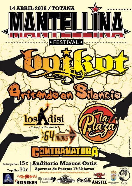 El I "Mantellina Festival" se celebrará en el auditorio del parque municipal "Marcos Ortiz de Totana el próximo 14 de abril, con la actuación de los grupos musicales "Boikot", "Gritando en silencio", "La Plaza", "Los Disi" tributo a la mítica banda de punk rock "Disidencia"- y "64 Nudos".
