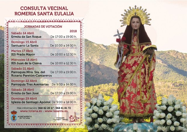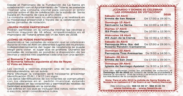 El Patronato de la Fundación La Santa de Totana, en colaboración con el Ayuntamiento, inicia este fin de semana la consulta vecinal programada con el fin de conocer el sentir popular sobre el día de la celebración de la subida de Santa Eulalia en romería, de cara al año 2020.