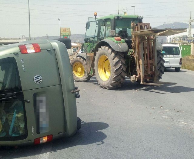 Servicios de Emergencias acuden a atender a un herido atrapado en el interior del vehículo tras colisionar con un tractor en Totana