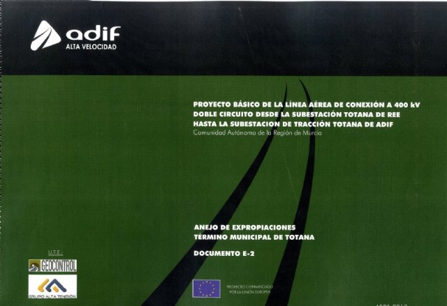 El BORM publicó el pasado 30 de abril la resolución de la Secretaría General de Infraestructuras de fecha 12 de abril de 2018 por la que se abre información pública correspondiente al expediente de expropiación forzosa 020ADIF1815, motivado por las obras del Adif-Alta Velocidad, “Proyecto básico de la línea aérea de conexión a 400 kv doble circuito desde la subestación de Totana REE hasta la subestación de tracción Totana de Adif”, en el término municipal de Totana (Murcia).