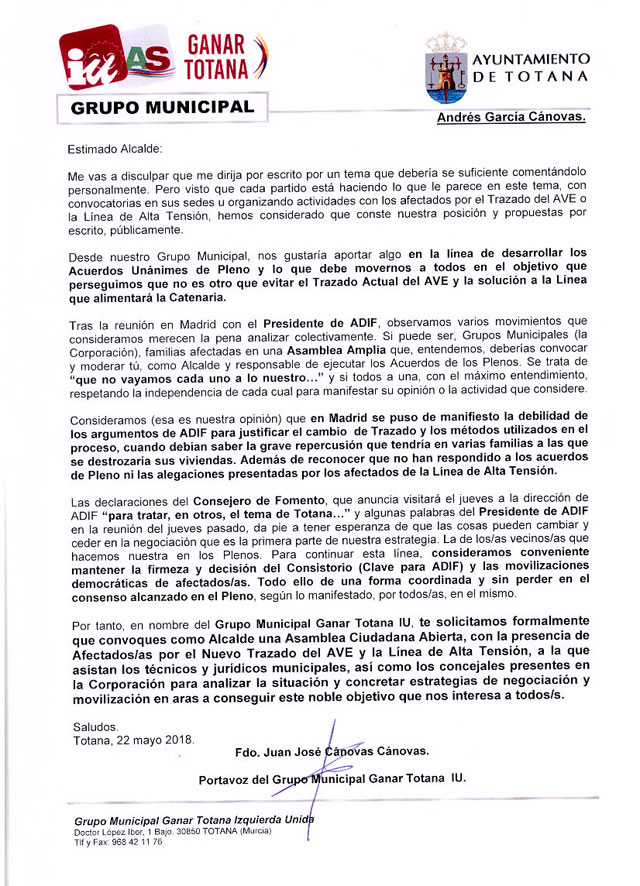 El Portavoz de Ganar Totana IU, Juan José Cánovas, se ha dirigido por escrito a Alcalde a primera hora de la mañana para solicitarle que convoque una Asamblea Ciudadana Abierta en la que estén presentes afectados, Concejales de la Corporación, Técnicos y Jurídicos municipales y ciudadanos en general para explicar la reunión celebrada en Madrid y coordinar las acciones a realizar en los próximos días en el marco de los Acuerdos aprobados de forma unánime por el Pleno en dos ocasiones.