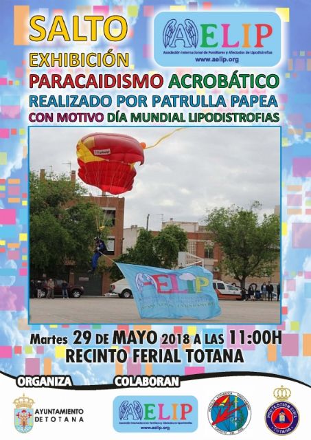 El Ayuntamiento de Totana y la Asociación Internacional de Familiares y Afectados de Lipodistrofias (AELIP) promueven el Salto de la Patrulla Acrobática de Paracaidismo del Ejército del Aire (PAPEA), que se celebra mañana 29 de mayo, a las 11:00 horas, en el recinto ferial; y que se enmarca dentro de los actos del Día Mundial de las Lipodistrofias que se celebró el pasado 31 de marzo.