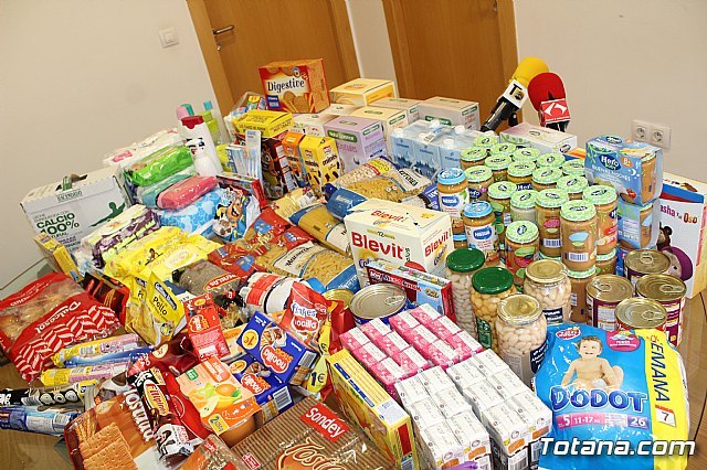 Empleados públicos del Ayuntamiento de Totana hicieron entrega hoy a Cáritas de ambas parroquias, Santiago y las Tres Avemarías, de los alimentos no perecederos y productos de aseo para la población infantil recogidos en el marco de una campaña interna promovida por los propios trabajadores y que se ha desarrollado durante las últimas tres semanas.