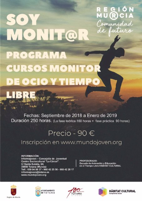 La Dirección General de Juventud de la Comunidad Autónoma, con la colaboración de la Concejalía del ramo del Ayuntamiento de Totana, van a ofertar el Curso de Monitor de Ocio y Tiempo Libre; que se realizará del viernes 28 de septiembre al sábado 26 de enero del 2019.