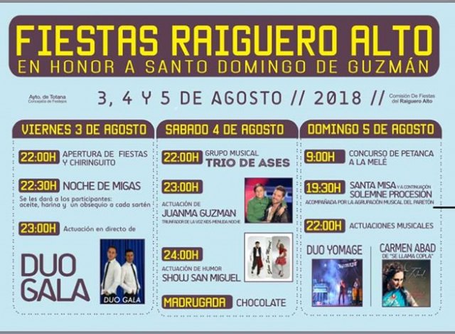 Las fiestas de la diputación de El Raiguero Alto, en honor a Santo Domingo de Guzmán, se celebran este próximo fin de semana, del 3 al 5 de agosto, organizadas por la Comisión de Festejos de esta pedanía y con la colaboración de la Concejalía de Festejos del Ayuntamiento de Totana.