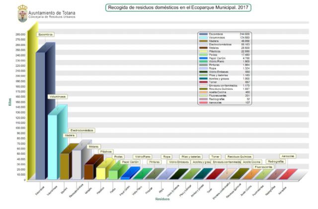 Los escombros de obras menores, los voluminosos (muebles, colchones y otros enseres), maderas y electrodomésticos son los residuos domésticos y comerciales más depositados en el ecoparque municipal por los usuarios de Totana, según se desprende del informe anual elaborado por la Concejalía de Medio Ambiente y Residuos Sólidos Urbanos correspondiente al año 2017.