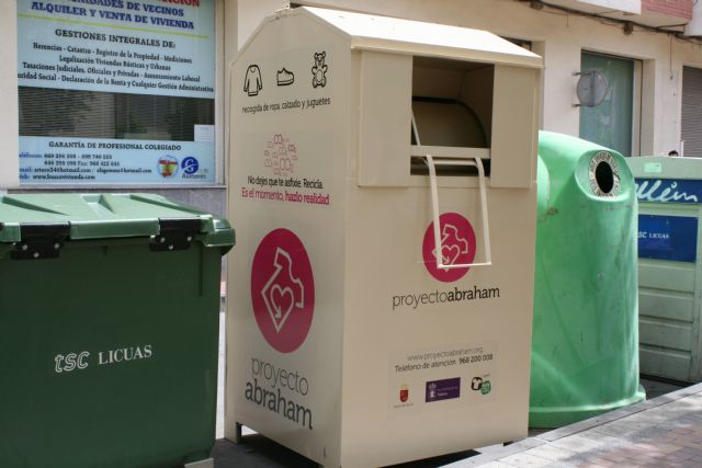 La Asociación "Proyecto Abraham" mantiene en el casco urbano de Totana la prestación del servicio de recogida en la vía pública, mediante la implantación de contenedores de ropa usada, calzado y juguetes.