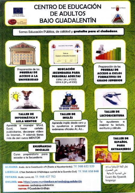 El Centro de Educación de Adultos "Bajo Guadalentín", con sede en el antiguo instituto "Juan de la Cierva" ubicado en la avenida de Lorca, 62; mantiene abierto el plazo de matriculaciones de toda la oferta formativa para el curso académico 2018/2019.