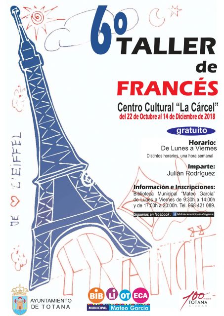 La Concejalía de Cultura organiza, a través de la Biblioteca Municipal "Mateo García", el 6° Taller de Francés, de carácter gratuito, que se celebrará del 22 de octubre al 14 de diciembre, en el Centro Sociocultural "La Cárcel", impartido por Julián Rodríguez.