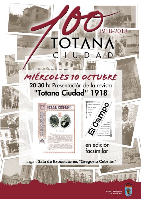 La Concejalía de Cultura recuerda que mañana miércoles, 10 de octubre, a las 20.30 horas, se presentará, en la sala de exposición municipal "Gregorio Cebrián", la revista "Totana Ciudad. 1918", en edición facsimilar, con motivo del programa de actos culturales y sociales organizados con motivo del Centenario de la Ciudad 1918-2018.