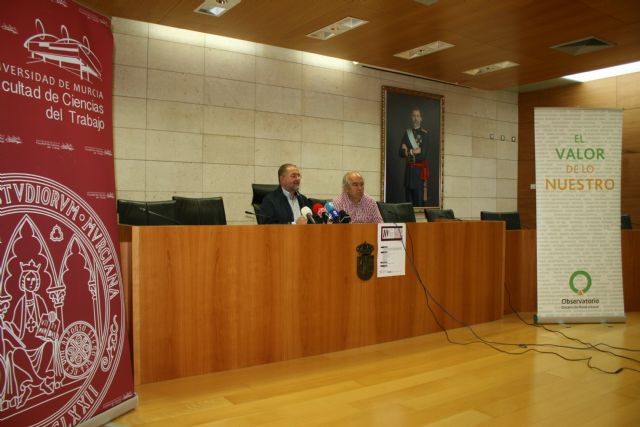 El primer teniente de alcalde y concejal de Desarrollo Económico, Juan José Cánovas, y el director de las jornadas y profesor titular del Departamento de Economía Aplicada de la UMU, Francisco Carreño, han presentado hoy esta actividad complementaria del Grado de Relaciones Laborales y Recursos Humanos de dicha facultad, que cuentan con la colaboración del Consistorio totanero.