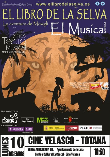 La Concejalía de Festejos va a organizar el musical "El libro de la selva. La aventura de Mowgli", el próximo 10 de diciembre, festividad de la Patrona de Totana, en el Cinema Velasco (18:30 horas) coincidiendo con el programa de actividades culturales y musicales de las fiestas patronales de Santa Eulalia.