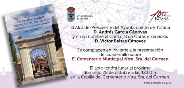 El mes de octubre concluirá la programación de actos organizados por la Concejalía de Cultura del Ayuntamiento de Totana para conmemorar el Centenario de la Ciudad con la presentación, este domingo día 28, del Cuadernillo sobre el Cementerio Municipal "Nuestra Señora del Carmen" (12:00 horas), en la propia capilla del camposanto, cuyo autor ha sido el historiador y cronista Juan Cánovas Mulero.