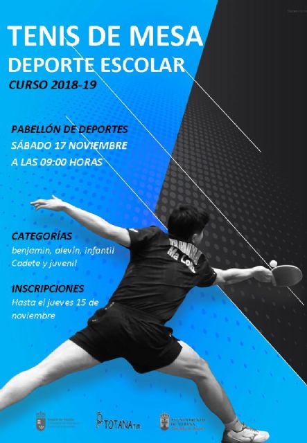 El Pabellón de Deportes "Manolo Ibáñez" acogerá el próximo sábado 17 de noviembre la Fase Local de Tenis de Mesa de Deporte Escolar, a partir de las 9.00 horas de la mañana, organizada por la Concejalía de Deportes del Ayuntamiento de Totana, en colaboración con el Club Tenis de Mesa Totana.