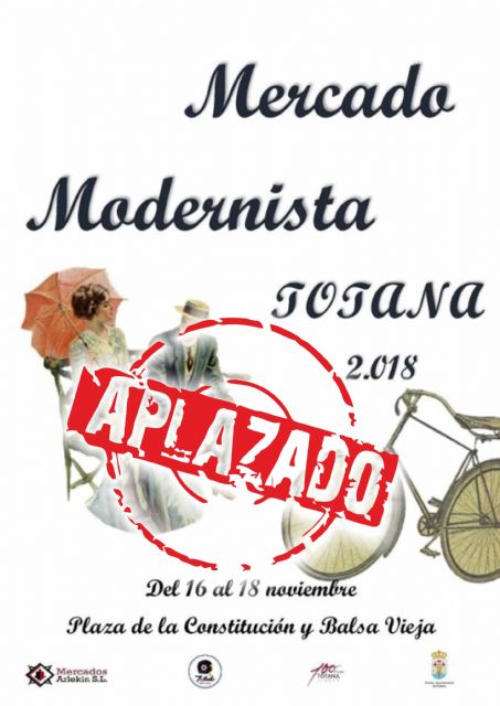 La Concejalía de Cultura comunica que se ha decidido suspender el Mercado Modernista que estaba previsto celebrarse este fin de semana del 16 al 18 de noviembre en las plazas de la Constitución y Balsa Vieja, organizado por el Ayuntamiento de Totana con motivo de los actos conmemorativos del Centenario de la Ciudad 1918-2018.