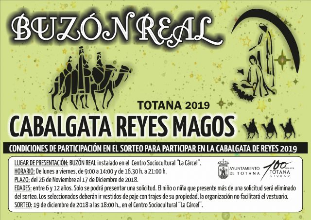 La Concejalía de Cultura ha dado a conocer recientemente las condiciones del sorteo del "Buzón Real" para participar en la Cabalgata de los Reyes Magos´2019, que permanecerá en el Centro Sociocultural "La Cárcel", del 26 de noviembre al 17 de diciembre, según informan fuentes de este departamento municipal.