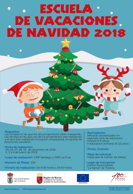 La Concejalía de Juventud del Ayuntamiento de Totana, un año más, pone en marcha el programa "Escuela de Navidad", un servicio de conciliación de la vida laboral, personal y familiar durante las próximas vacaciones escolares de Navidad, que es totalmente gratuito.