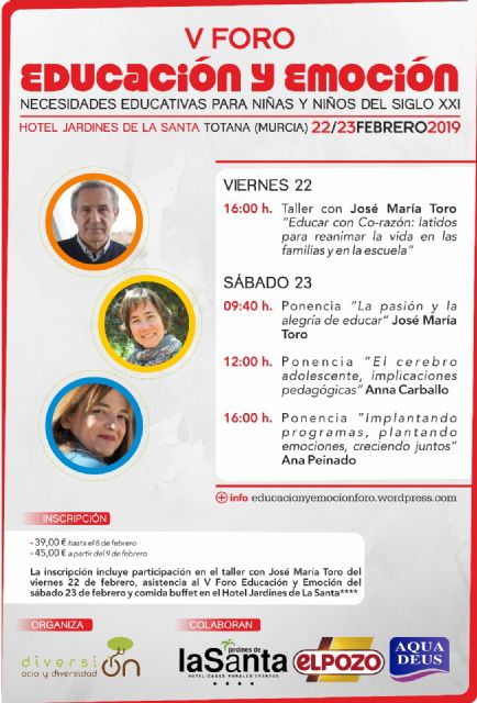 La Asociación “Diversi-on Ocio y diversidad” organiza por quinto año consecutivo el “V Foro Educación y Emoción”, evento que tendrá lugar durante los días 22 y 23 de febrero en el Hotel “Jardines de La Santa” en Totana. Evento en el que se abordarán temáticas referentes sobre un tema tan de actualidad como es la educación emocional.