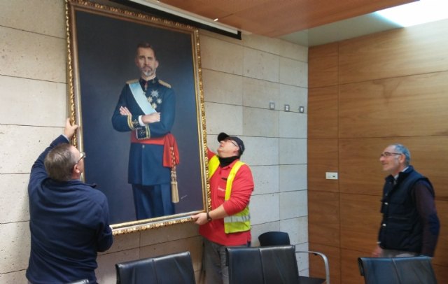 Operarios municipales han procedido hoy a la retirada, para su pertinente devolución, del cuadro del rey Felipe VI donado temporalmente por un vecino de Totana, que ha permanecido en el salón de plenos del Ayuntamiento, a título institucional, con motivo de la celebración del Centenario de la Ciudad 1918-2018