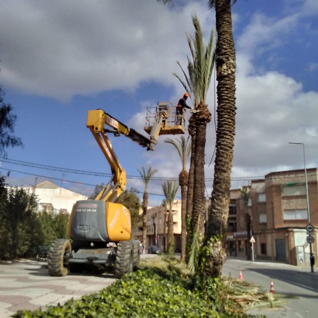 Operarios de la Concejalía de Servicios a la Ciudad e Infraestructuras están procediendo durante estos días a los trabajos de poda y mantenimiento de la población de palmeras en las vías públicas y en los parques y jardines de Totana. Esta semana se están centrando los trabajos en la población de palmeras de la avenida de Lorca de esta localidad.