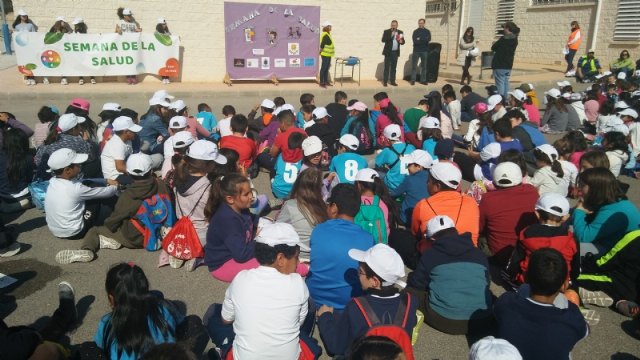 El alcalde de Totana, Andrés García, y los concejales Agustín Gonzalo Martínez y María José Bedia, en representación de la Corporación municipal, asistieron hoy al acto de clausura de la XII Semana de la Salud del CEIP “La Cruz” que se ha celebrado bajo el lema “Me conozco, me quiero y me respeto”, del 5 al 15 de febrero, y que ha culminado con la celebración de la III Caminata Saludable.