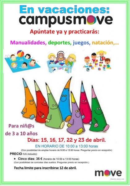 Un año más el Centro deportivo move organiza un campus de Semana Santa para todos aquellos niñ@s que quieran disfrutar de las actividades acuáticas, juegos, deportes y manualidades.