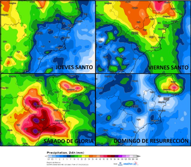 SÁBADO DE GLORIA: parece que será el día más inestable, sobre todo durante la primera mitad del día. Las lluvias pueden ser fuertes y persistentes, pudiéndose acumular importantes cantidades de lluvia. Las lluvias serán menos intensas y frecuentes por la tarde.