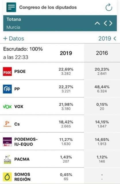 El Partido Socialista Obrero Español (PSOE) logró hoy en Totana un total de 3.282 votos (22,69%); el Partido Popular 3.221 (22,27%), VOX 3.180 (21,98%), Ciudadanos-Partido de la Ciudadanía 2.665 (18,42%) y Unidas Podemos 1.630 (11,27%).
